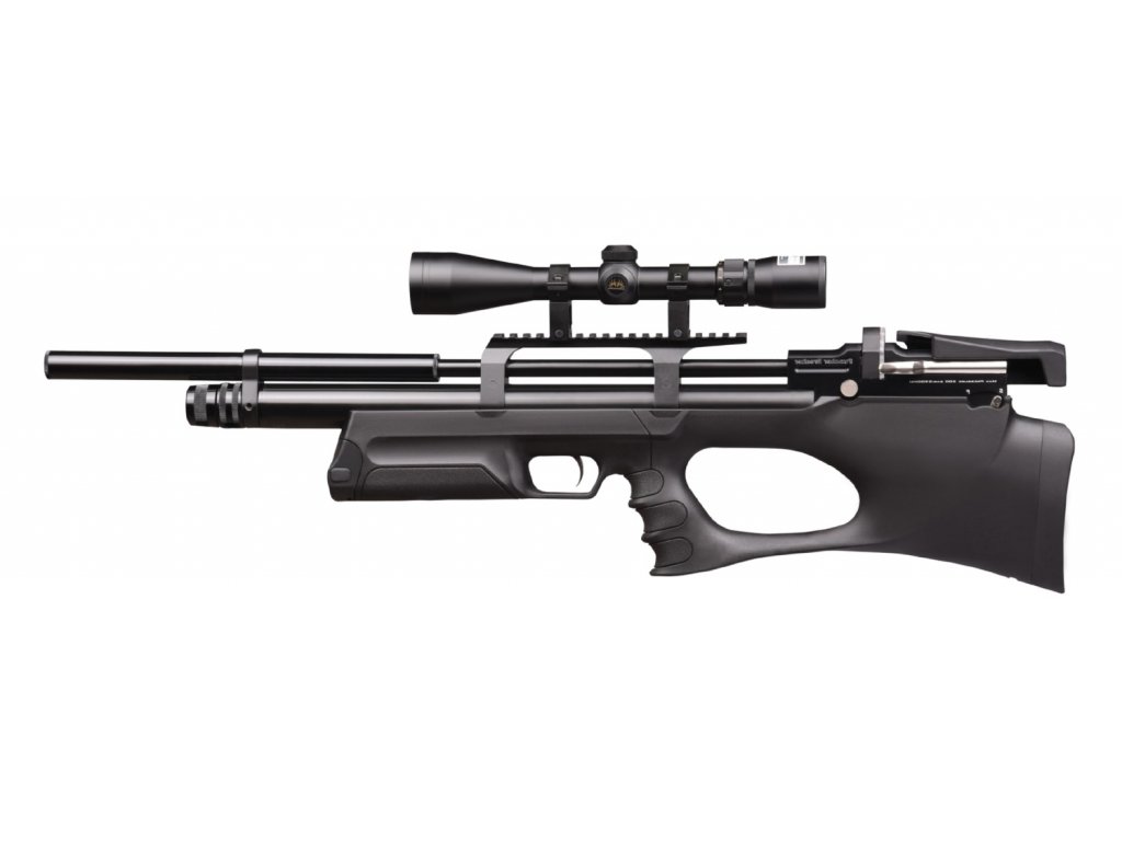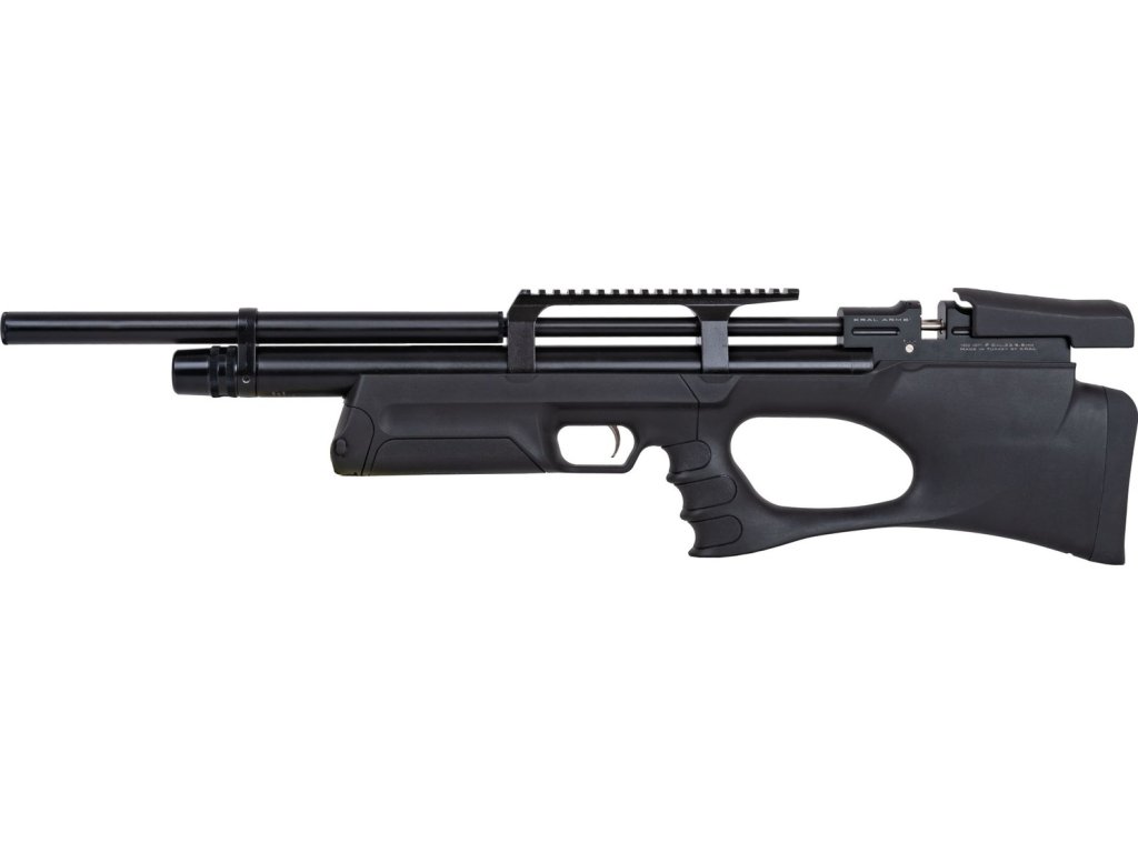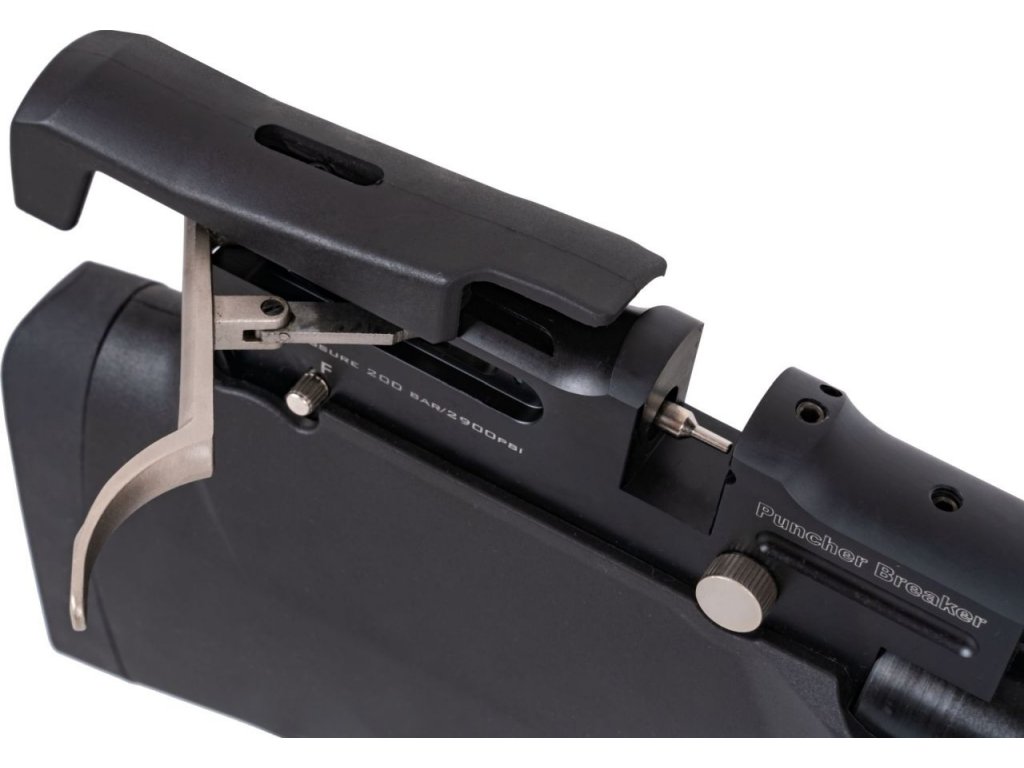 Celý systém Bullpup větrovky Kral Puncher Breaker S výrobce osadil do polymerové pažby, díky Bullpup konstrukčnímu řešení dosahuje pouze 730 mm celkové délky.